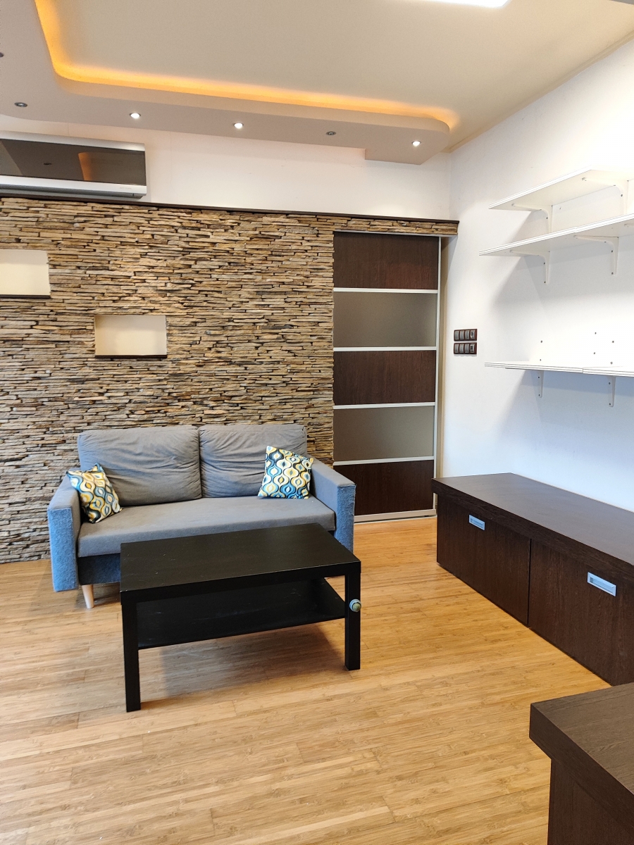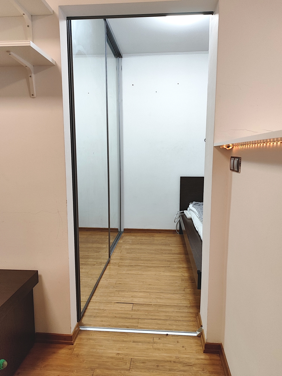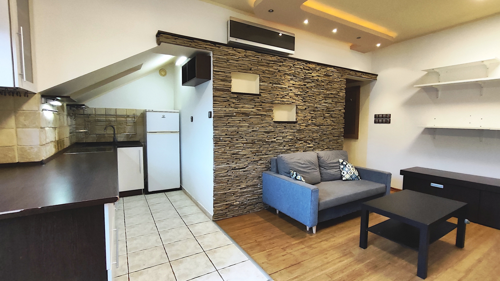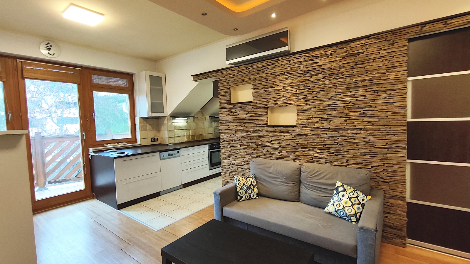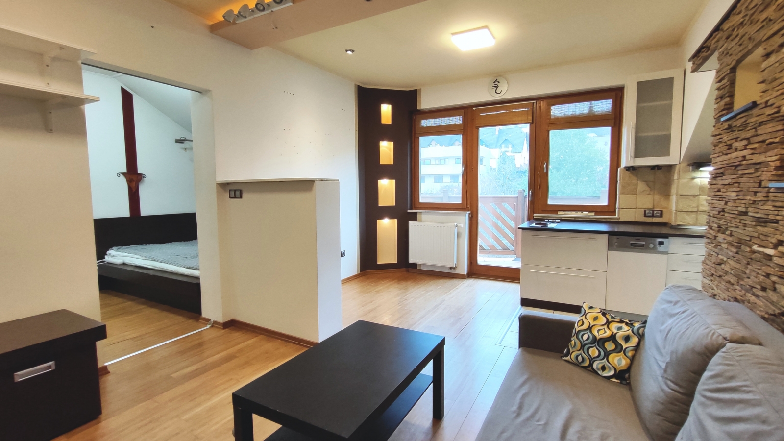 A lakásban egy 24m2-es egylégterű nappali-étkező-konyha, egy hálószoba hatalmas gardróbbal, és egy fürdőszoba található.