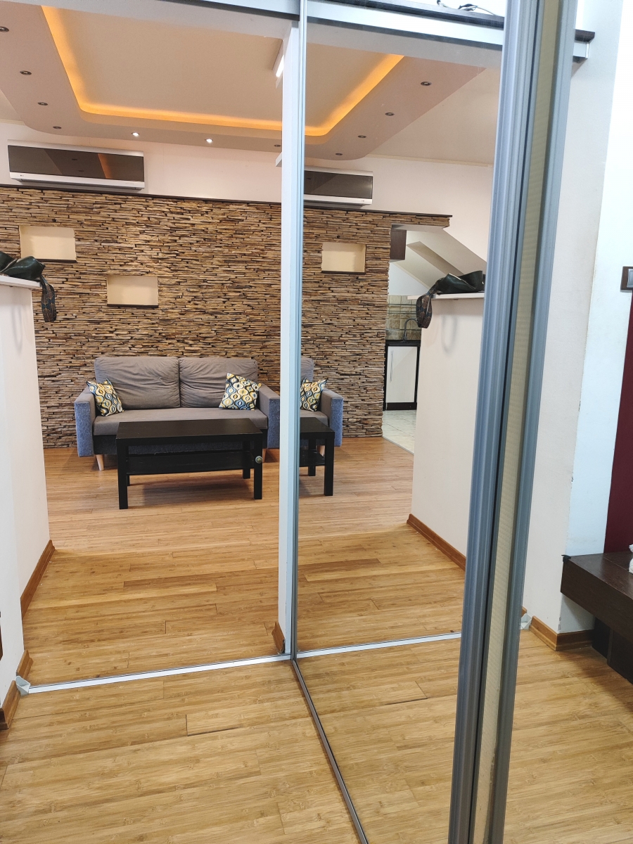 A lakás a 4.emeleten található, részben tetőtéri.