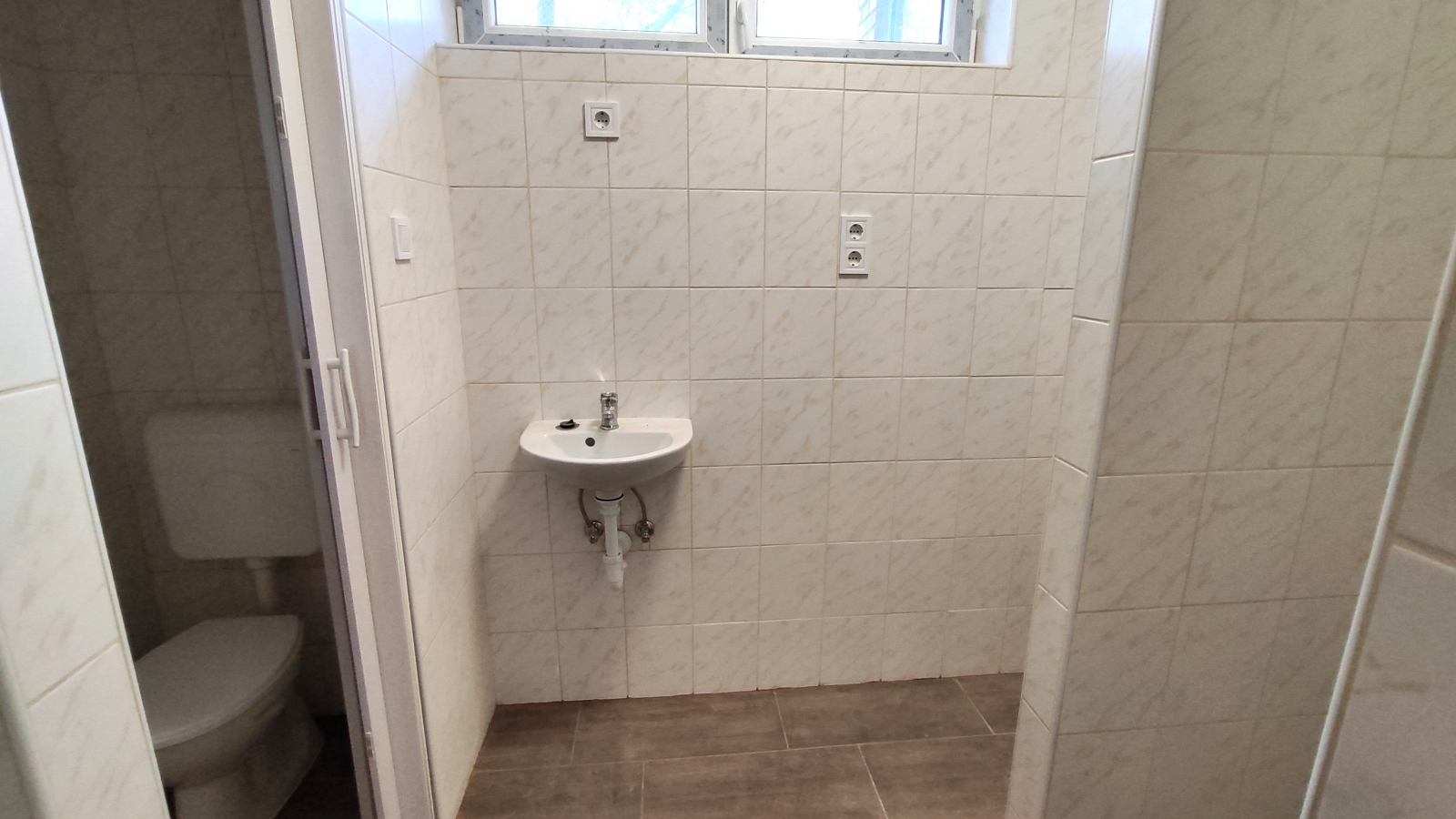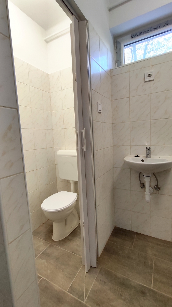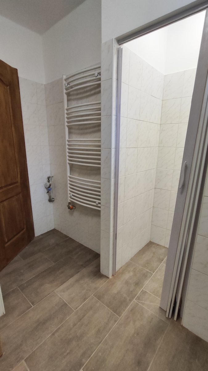 A fürdőszoba épített tusolóval, külön wc-vel, mosógépkiállással lett kialakítva.