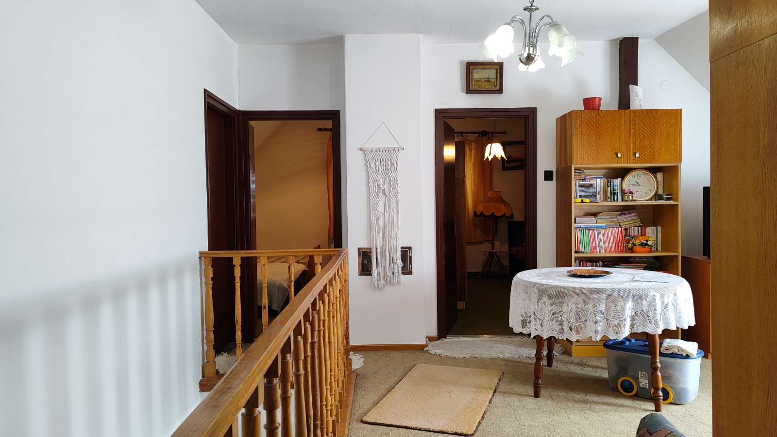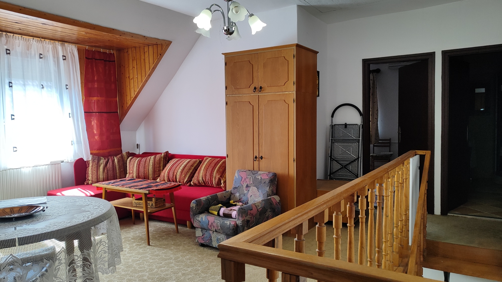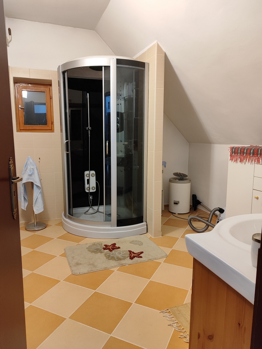 -az alsó szinten nappali, szoba, előtér-étkező, konyha és fürdőszoba, valamint egy nagy 38m2-es fedett, zárt veranda található.