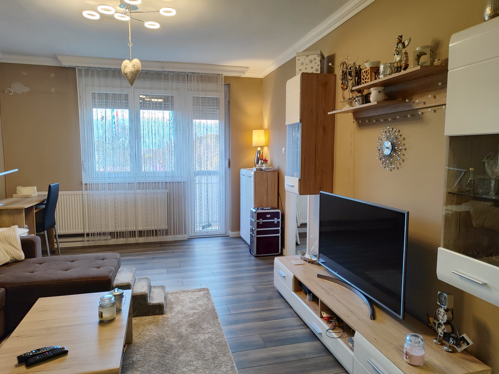 A lakás fűtése Ariston kombi gázkazánnal, radiátorokon keresztül is történik, a melegvizet szintén a kazán adja. A nyári hűtéséről a nappaliban lévő klíma gondoskodik.