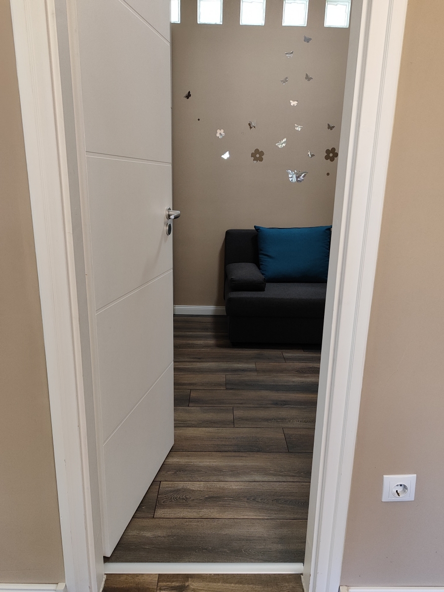 A szobákban lamináltlap burkolat, a többi helyiségben kő, ez alatt fut a padlófűtés.